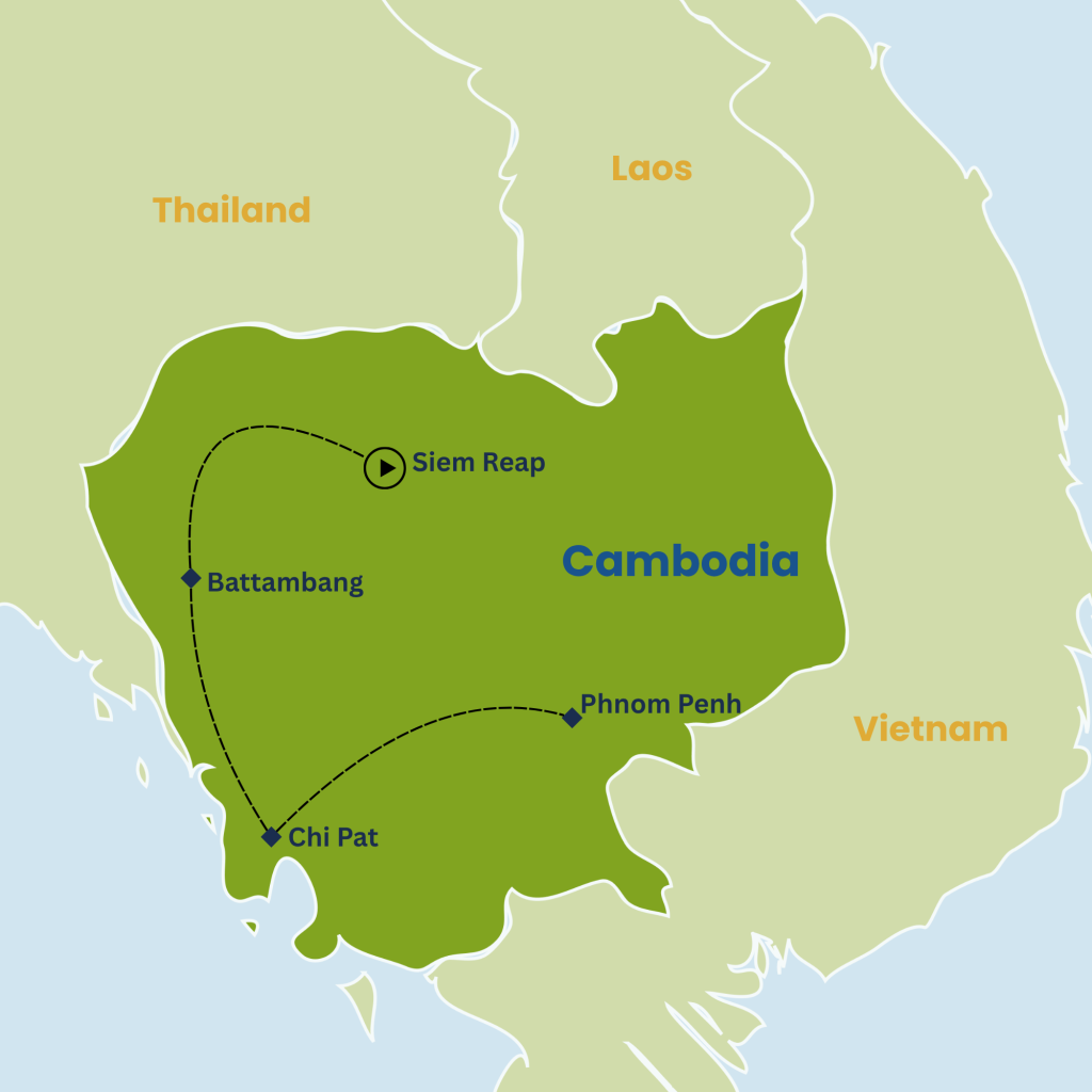 Embark on a trek to Kulen Mountain, one of Cambodia’s holiest sites. Discover ancient stone carvings of Shiva, Vishnu, and Ganesh at Poeng Tbal, then visit Prasat Rong Chen, where Jayavarman II declared sovereignty. Explore the Bat Cave, Srah Damrei with its stone elephant, and enjoy a picnic at Elephant Pond. End the day with a refreshing swim at Kulen Waterfall.