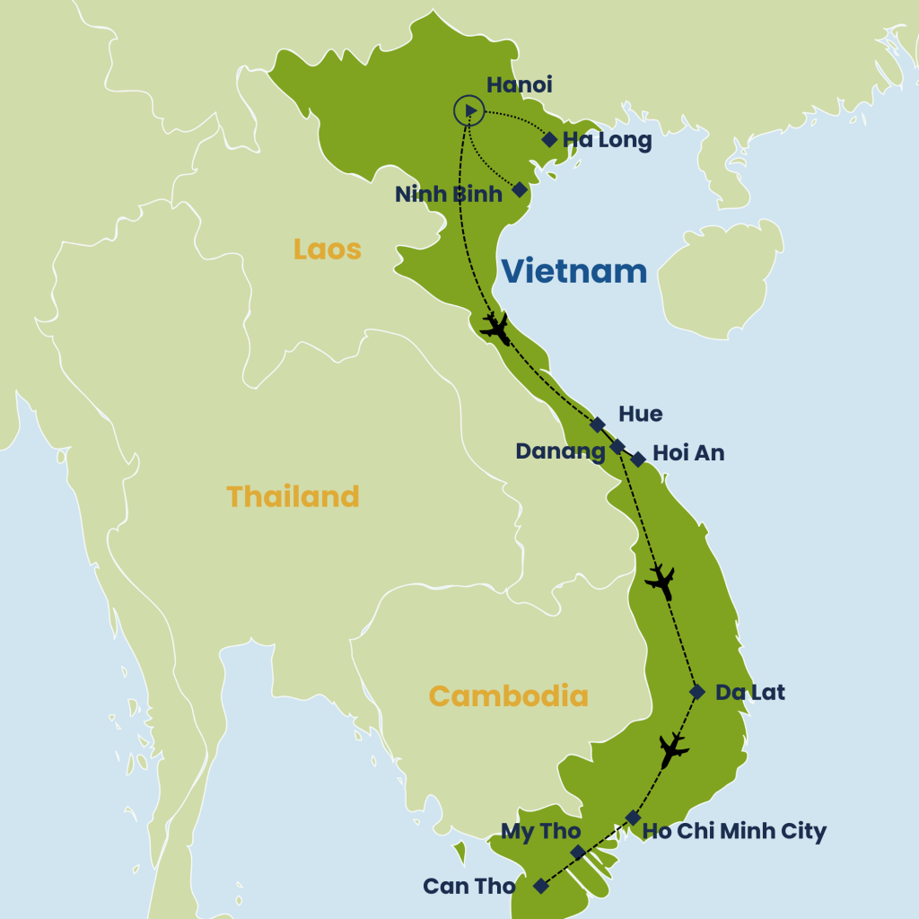 This 13-day Vietnam package tour offers a comprehensive journey through the country’s most iconic cities, landscapes, and cultural highlights from north to south. Begin in Hanoi with immersive city tours and a day trip to Ninh Binh, followed by a scenic cruise through the limestone formations of UNESCO-listed Halong Bay. Continue to central Vietnam to explore the imperial heritage of Hue, the historic charm of Hoi An, and the cool highlands of Dalat with its countryside and agricultural experiences. Travel onward to vibrant Ho Chi Minh City, including visits to Tay Ninh, the Cu Chi Tunnels, and the Mekong Delta’s floating markets. Designed for travelers seeking culture, history, nature, and local experiences, this itinerary balances guided sightseeing with comfortable pacing and regional diversity.