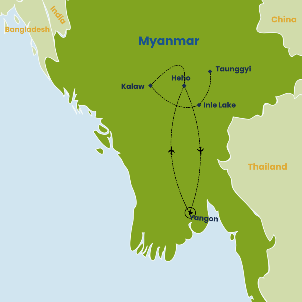 This 6-day journey through Myanmar offers an inspiring blend of culture, spirituality, and scenic beauty. Begin in Yangon, where the golden Shwedagon Pagoda shines as the nation’s spiritual heart before flying to the serene hill town of Kalaw, known for its vibrant markets, colonial charm, and panoramic mountain views. Continue to the tranquil waters of Inle Lake, exploring floating villages, ancient monasteries, and lakeside temples that reflect the unique traditions of the Intha people. Experience authentic local life in Khaung Daing village and Taunggyi, where pagodas crown the hills and offer sweeping vistas of the Shan countryside. Conclude your adventure back in Yangon, visiting the magnificent Chaukhtatgyi Reclining Buddha, scenic Kandawgyi Park, and the lively Yangon River, leaving you with unforgettable memories of Myanmar’s timeless beauty and warm hospitality.