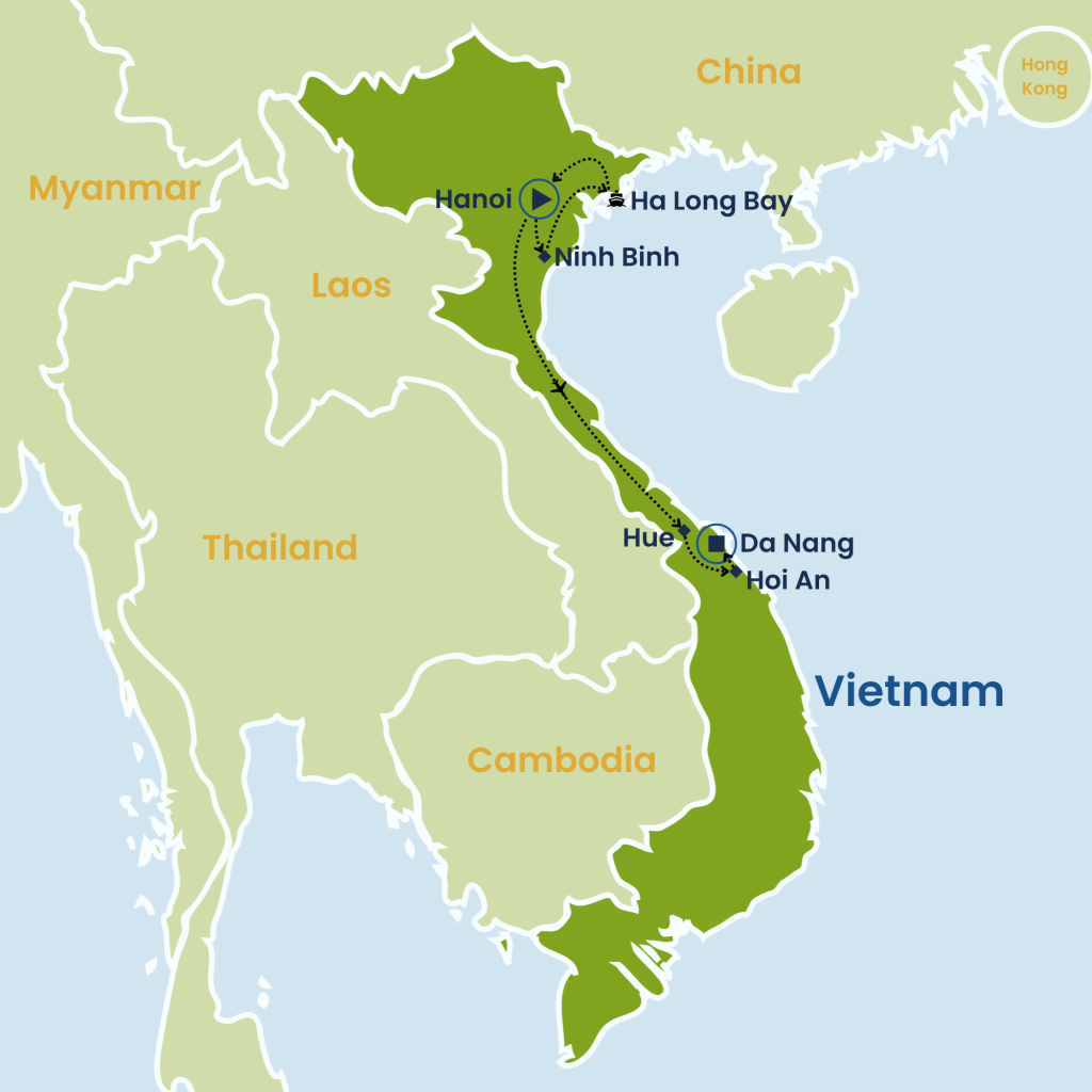 This tour offers a perfect introduction to Vietnam, combining rich cultural experiences with breathtaking landscapes. Explore the bustling streets of Hanoi, the ancient capital of Hue, and the charming town of Hoi An, with its preserved heritage. Discover Vietnam’s natural beauty in Ninh Binh and Halong Bay. Ideal for those seeking a quick yet comprehensive visit, this tour also provides the option to unwind on the stunning beaches of Vietnam’s central coast, with a beach extension available in Hoi An or Danang for a relaxing end to your adventure.