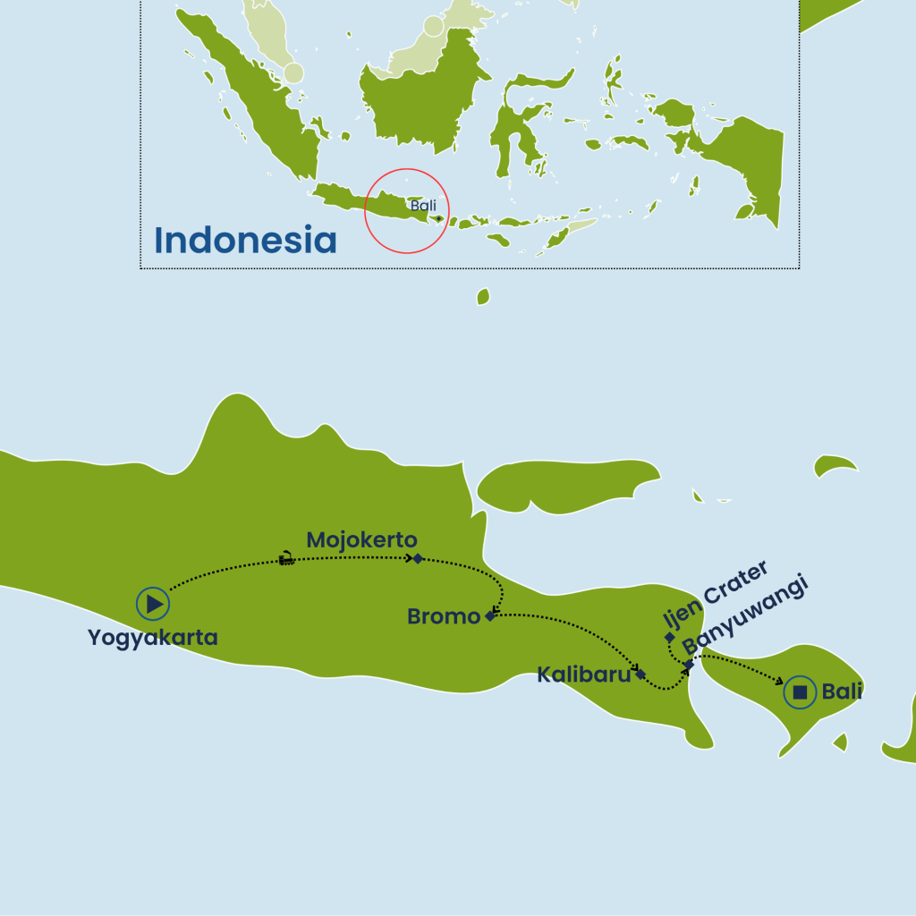 Experience the best of Java and Bali on this captivating 9-day journey through Indonesia’s cultural and natural wonders. Begin in Yogyakarta, exploring the awe-inspiring Borobudur and Prambanan temples, and immersing yourself in village life and Javanese traditions. Travel by train across lush countryside to the volcanic landscapes of Mount Bromo, where a sunrise jeep adventure reveals otherworldly panoramas. Continue to Kalibaru to discover fragrant coffee, clove, and cacao plantations before trekking to the turquoise crater lake of Mount Ijen, with the option to witness its famed Blue Fire. Cross by ferry into Bali and unwind in Ubud, surrounded by serene beauty and artistic charm. Blending heritage, adventure, and breathtaking landscapes, this journey promises unforgettable memories from start to finish.